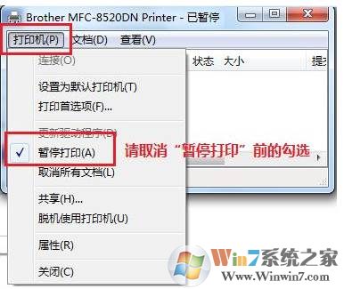 2、然后在打的的窗口中,點擊菜單上的打印機,取消暫停打印的選項就可以了。