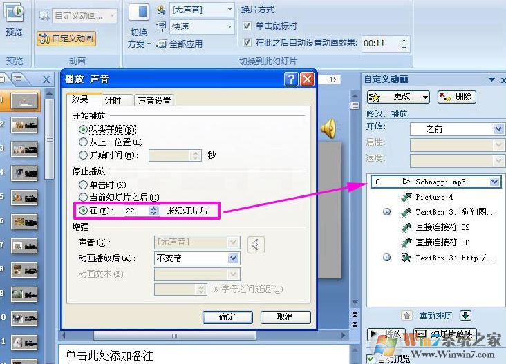 在之前第一種添加好音樂的基礎(chǔ)上,菜單欄“動畫”,設(shè)置聲音文件圖標(biāo)的“自定義動畫”:右擊——效果選項——效果——停止播放——在幾張幻燈片之后(要整首歌曲播放到幻燈片完,就填寫你全部幻燈片的張數(shù),例如我這個幻燈片總共有3張,我就填23張)——確定就可,如圖:
