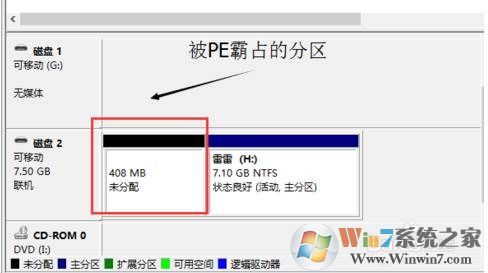 從磁盤管理中我們可以看到被隱藏的分區(qū),顯示未分配。