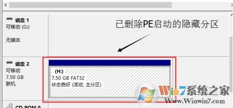 3、刪除完成后,U盤隱藏分區(qū)沒有了,U盤也恢復(fù)至原來的一個分區(qū)和容量。從磁盤管理中我們也可以看到U盤變成一個了。