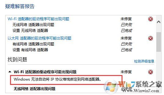 win10 windows無(wú)法自動(dòng)將IP協(xié)議堆棧綁定到網(wǎng)絡(luò)適配器怎么辦?近期使用wn10系統(tǒng)的用戶在電腦中使用無(wú)線網(wǎng)卡連接上網(wǎng)的時(shí)候遇到了無(wú)法正常上網(wǎng)的現(xiàn)象,然后使用疑難解答功能進(jìn)行檢測(cè),發(fā)現(xiàn)了導(dǎo)致無(wú)法聯(lián)網(wǎng)的原因,但是無(wú)法修復(fù),提示:windows無(wú)法自動(dòng)將IP協(xié)議堆棧綁定到網(wǎng)絡(luò)適配器。 如下圖所示: