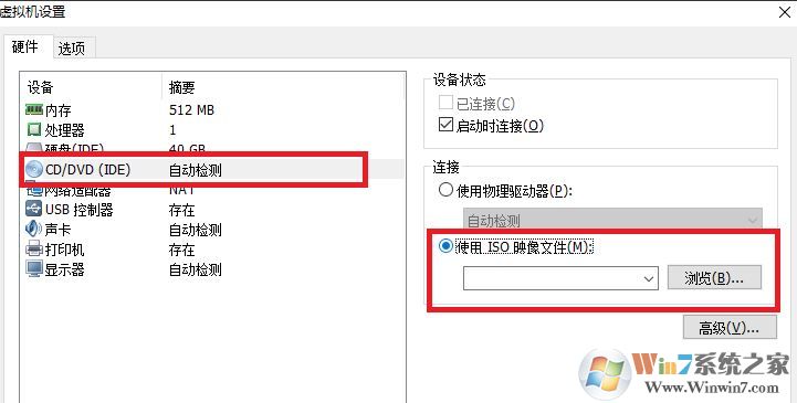 8、選中CD和DVD,設備狀態(tài)選啟動時連接,選中使用ISO映像文件,點擊瀏覽,如圖: