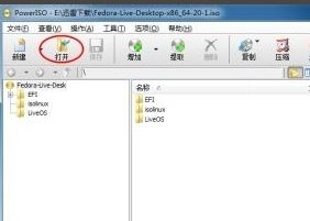 2、打開(kāi)安裝完成后的PowerISO,在軟件菜單欄中點(diǎn)擊打開(kāi),加載Fedora鏡像,如圖: