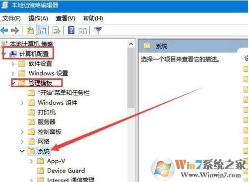 2、這時(shí)就會(huì)打開(kāi)本地組策略編輯器窗口,在這時(shí)依次點(diǎn)擊“計(jì)算機(jī)配置/管理模板/系統(tǒng)”菜單項(xiàng)。