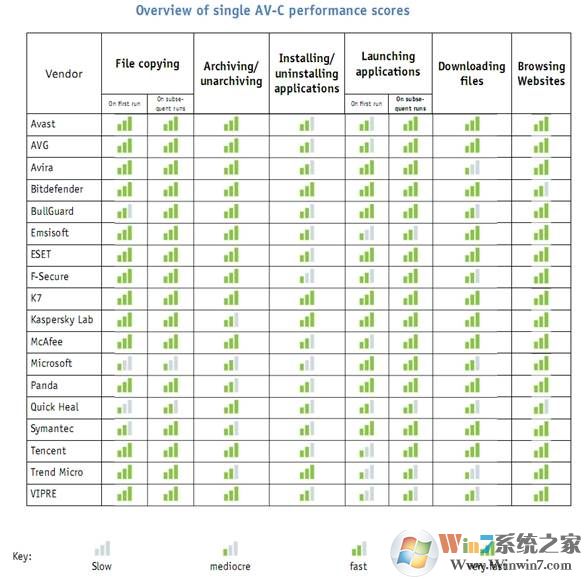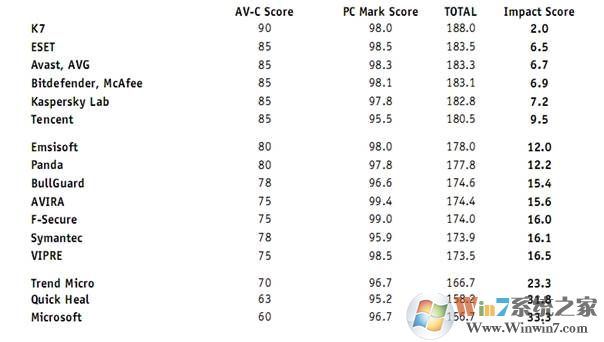 沒想到吧?Windows 10自帶的Windows Defender竟然是最大的拖累,之后是Quick Heal(來自印度)、趨勢科技,三者都被定級為標準性能,賽門鐵克的也排在第五位。Win7系統下載 www.cncxm.com