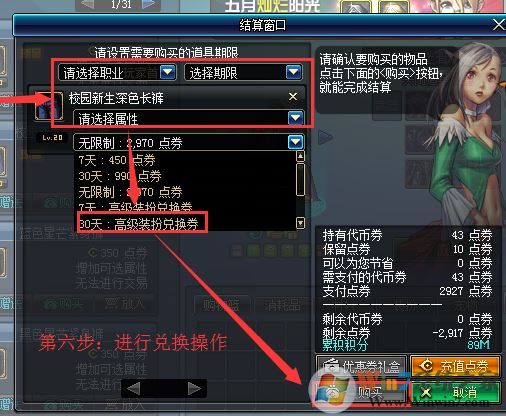 4、選擇好需要更換的時(shí)裝,然后我們選擇好職業(yè), 使用期限,然后選擇時(shí)裝的屬性,最后我們點(diǎn)擊購買即可。