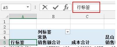 第四步,更改行標(biāo)簽與列標(biāo)簽單元格文字,選中,點擊編輯框,將之更改為訂購日期與所屬區(qū)域即可。