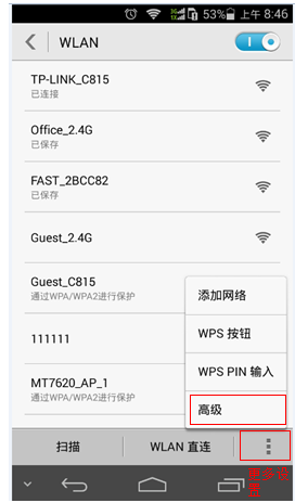 點(diǎn)開WLAN后,在右下角點(diǎn)擊 更多設(shè)置,在出現(xiàn)的菜單選項(xiàng)中點(diǎn)擊 高級(jí),如下圖所示: