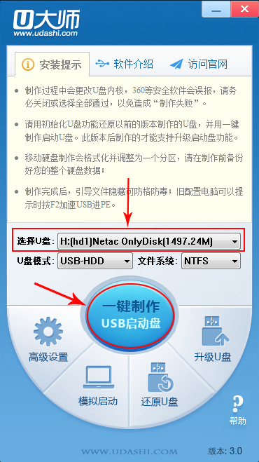 安裝完成后,彈出U大師U盤制作界面,插入你的U盤,點(diǎn)擊一鍵制作。