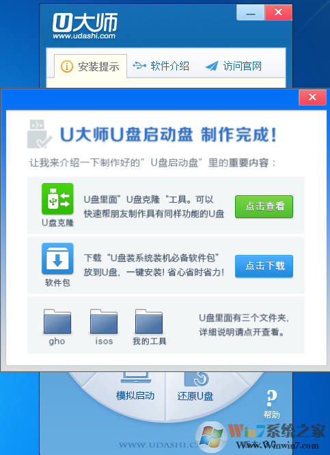6、制作完成后,會(huì)彈出“u大師u盤啟動(dòng) 制作完成”的提示。