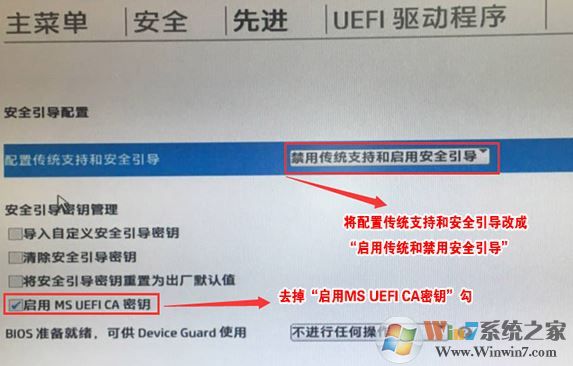 3、回車(chē)后,將配置傳統(tǒng)支持和安全引導(dǎo)設(shè)置電腦“啟用傳統(tǒng)支持和禁用安全引導(dǎo)”以及去掉“啟用MS UEFI CA密鑰”前面的勾,然后按F10保存更改;
