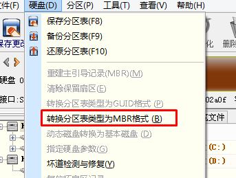 2、刪除分區(qū)后,裝換硬盤分區(qū)表類型 為 MBR 格式,同樣還是從“硬盤”——“轉(zhuǎn)換分區(qū)表類型為MBR格式”,然后保存更改(以下為圖示,此時該項為可點,如不可點說明已經(jīng)轉(zhuǎn)換好了。)