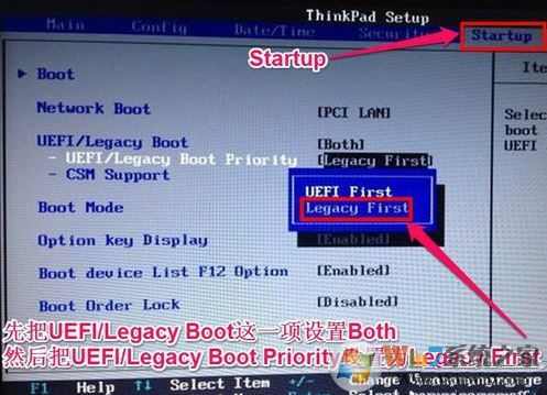 3、選擇startup,在UEFI/legac boot priority下,設置為Legacy First(傳統(tǒng)模式優(yōu)先)。