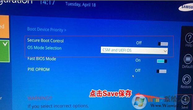 3、關(guān)閉安全啟動(dòng)后,BOOT選項(xiàng)中就會(huì)多出一個(gè)OS Mdoe Selection選項(xiàng),我們將默認(rèn)的UEFI OS改為CSM OS或CSM and UEFI OS,如下圖所示;