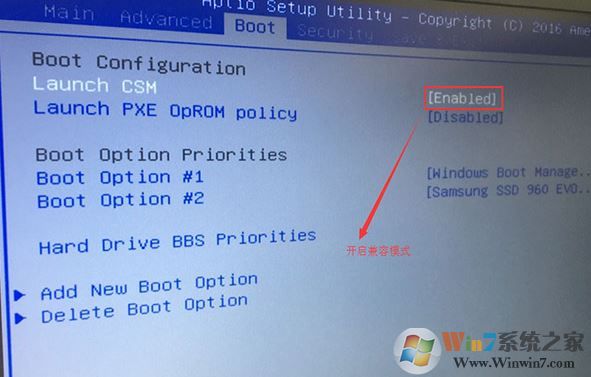 2、重啟后切換到BOOT的選項(xiàng),把Launch CSM由disabled改成enabled,開啟兼容模式;
