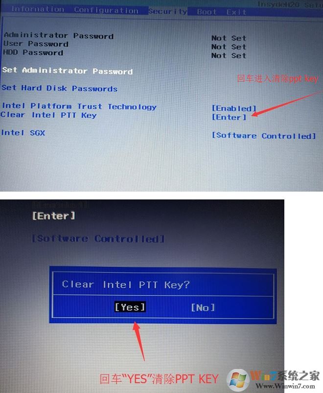 注:按如果Security選項(xiàng)下沒有Secure Boot選項(xiàng),看下是否有"clear intel PTT Key"選項(xiàng),如果有進(jìn)入回車選選擇“yes”清除ppt key,否則無法安裝系統(tǒng)后無法引導(dǎo)啟動(dòng),如圖: