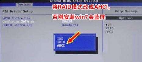 4、切將鍵盤移動Devices選項,把鍵盤移動ATA Drive Setup回車,將configure SATA as中默認的raid改成ahci模式,否則安裝win7時會出現(xiàn)0x0000007b藍屏,因為win7中沒有集成raid硬盤驅動,然后選擇F10保存設置,在彈出的選項中選擇YES,如下圖所示;