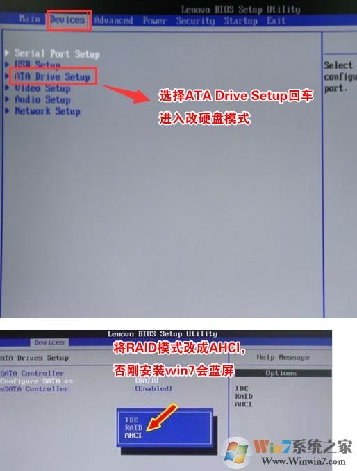 4、切將鍵盤移動Devices選項,把鍵盤移動ATA Drive Setup回車,將configure SATA as中默認的raid改成ahci模式,否則安裝win7時會出現(xiàn)0x0000007b藍屏,因為win7中沒有集成raid硬盤驅(qū)動,然后選擇F10保存設(shè)置,在彈出的選項中選擇YES,如下圖所示;