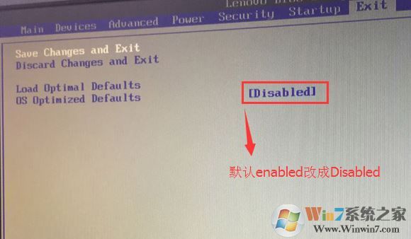 2、轉(zhuǎn)到Exit,把OS Optimized Defaults設(shè)置為Disabled,改成支持win7系統(tǒng)模式,如下圖所示;
