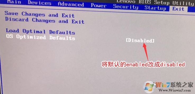 2、轉(zhuǎn)到Exit,把OS Optimized Defaults設(shè)置為Disabled;