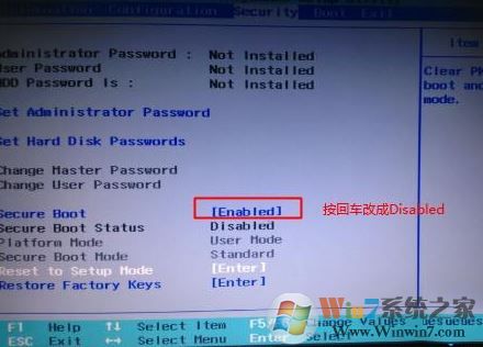 1、開機(jī)一直按F2或(FN+F2)進(jìn)入BIOS,按→方向鍵切換到Security,選擇Secure Boot回車設(shè)置成Disabled;