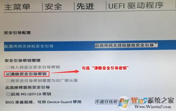 4、F10保存重啟后再次開機(jī)按ESC,然后選擇F10進(jìn)入BIOS設(shè)置,將進(jìn)入剛設(shè)置的地方,勾選“清除安全引導(dǎo)密鑰”,然后再次F10保存,如圖:
