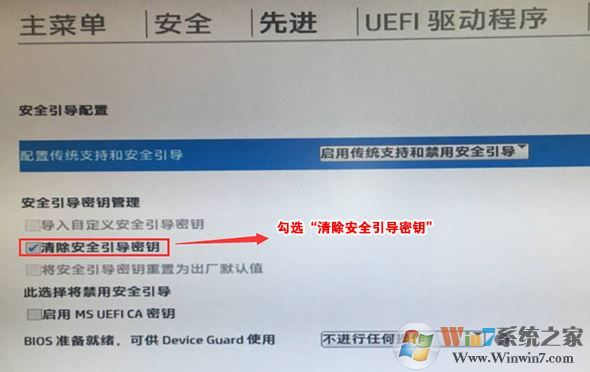 4、F10保存重啟后再次開(kāi)機(jī)按ESC,然后選擇F10進(jìn)入BIOS設(shè)置,將進(jìn)入剛設(shè)置的地方,勾選“清除安全引導(dǎo)密鑰”,然后再次F10保存;