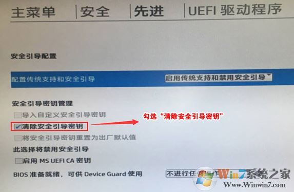 4、F10保存重啟后再次開機按ESC,然后選擇F10進(jìn)入BIOS設(shè)置,將進(jìn)入剛設(shè)置的地方,勾選“清除安全引導(dǎo)密鑰”,然后再次F10保存;