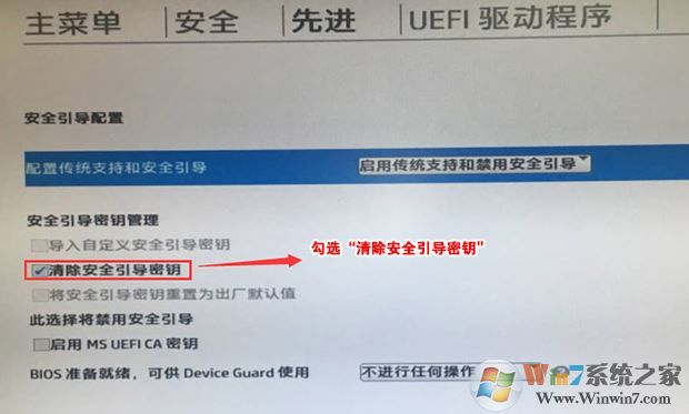 4、F10保存重啟后再次開(kāi)機(jī)按ESC,然后選擇F10進(jìn)入BIOS設(shè)置,將進(jìn)入剛設(shè)置的地方,勾選“清除安全引導(dǎo)密鑰”,然后再次F10保存;
