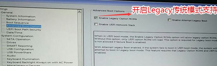 3、切換到Advanced Boot Options將右邊的Enable legacy option roms選項(xiàng)打勾,如下圖所示;
