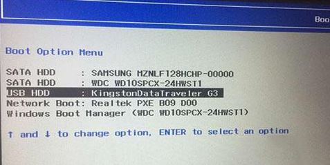 4、插入制作好的U盤啟動盤,重啟按F12或FN+F12調(diào)出啟動管理對話框,選擇USB HDD識別到U盤啟動進入PE,回車;
