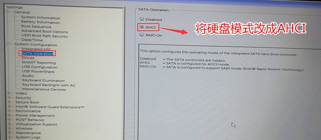 4、切換到system configuration項,將sata operatior硬盤模式改為ahci模式,否則安裝win7會同現(xiàn)0x0000007b藍屏,如下圖所示;