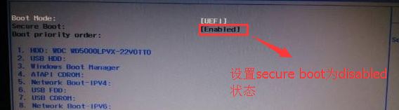 返回BOOT選項,將Secure BOOT默認enabled為disabled,關(guān)閉安全啟動