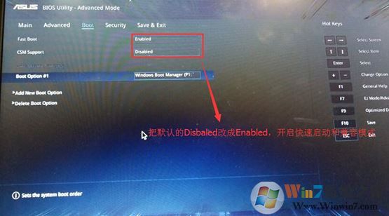 2、重啟后切換到BOOT的選項(xiàng),分別把fast boot和csm support由disabled改成enabled,分別開啟快速啟動(dòng)和兼容模式;