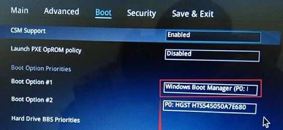4、繼續(xù)把boot option#1選項(xiàng)改為普通引導(dǎo)的,boot option#1和boot option#2硬盤啟動位置對換,設(shè)置第一啟動項(xiàng)為普通硬盤引導(dǎo),帶Windwos Boot Manager的為UEFI引導(dǎo)分區(qū),然后按F10保存設(shè)置;