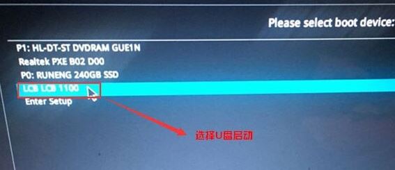 5、插入U盤啟動盤,重啟按ESC選擇識別到U盤啟動項,回車;