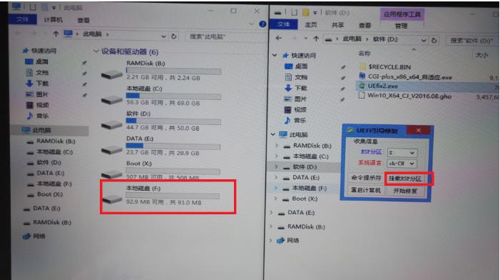 2、完成之后重啟(有些平板可以不重啟就執(zhí)行下面的,但是如果你執(zhí)行了沒反應(yīng),或者跟下面圖示不一致,則重啟之后再操作),但是如果拔掉U盤,你還無法直接啟動(dòng)的(因?yàn)镋FI分區(qū)啟動(dòng)信息有問題,雖然C盤已經(jīng)有了Ghost的文件,但還需要引導(dǎo),如果既沒有插入可啟動(dòng)的U盤,本身系統(tǒng)又啟動(dòng)不了,就會(huì)停留在Surface UEFI界面上,只能插入U(xiǎn)盤,然后Exit頁面點(diǎn)重啟)。為了修復(fù)這個(gè)啟動(dòng)問題,再次從U盤啟動(dòng)PE,然后雙擊UEfix2.exe,點(diǎn)擊掛在ESP分區(qū),然后可以發(fā)現(xiàn)計(jì)算機(jī)中多了一個(gè)F盤(大概93M左右)