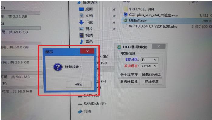 4、UEFI引導(dǎo)提示修復(fù)成功,再次重新啟動(dòng),就可以開始重裝系統(tǒng)了