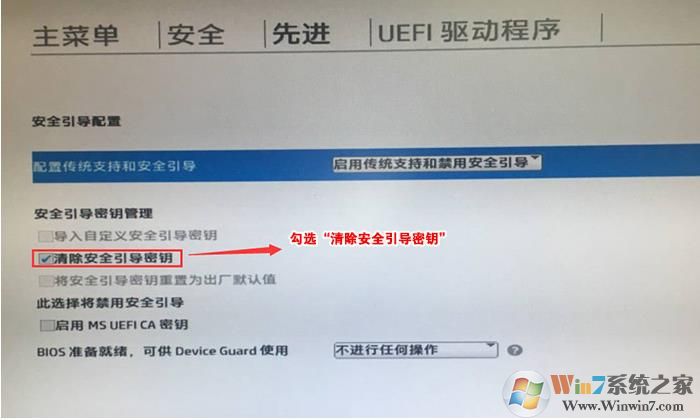4、F10保存重啟后再次開機(jī)按ESC,然后選擇F10進(jìn)入BIOS設(shè)置,將進(jìn)入剛設(shè)置的地方,勾選“清除安全引導(dǎo)密鑰”,然后再次F10保存;