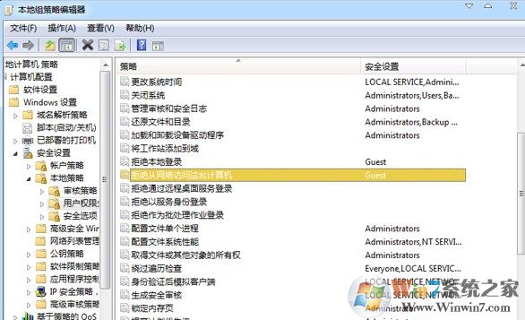 2)擇計(jì)算機(jī)配置-》Windows設(shè)置-》安全設(shè)置-》本地策略-》用戶權(quán)限分配-》拒絕從網(wǎng)絡(luò)訪問這臺(tái)計(jì)算機(jī),將Guest刪除即可。