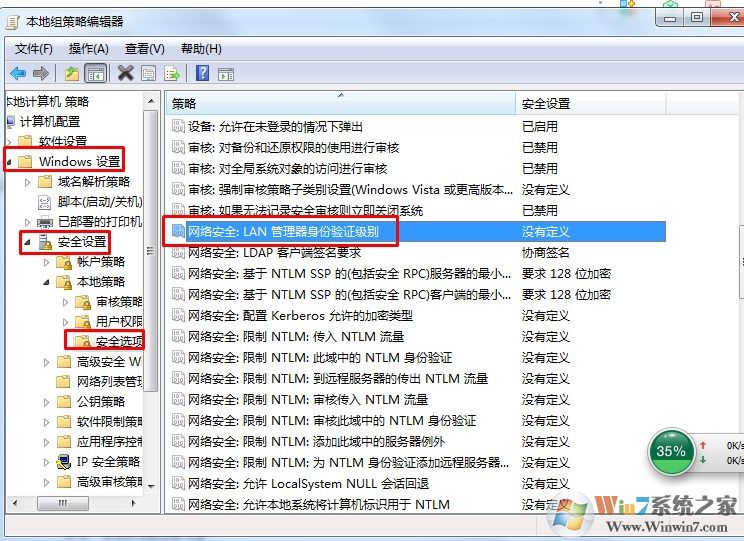 2、依次展開計算機(jī)配置——Windows設(shè)置——安全設(shè)置——本地策略,點擊安全選項找到網(wǎng)絡(luò)安全:LAN 管理器身份驗證級別;