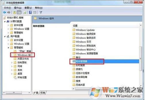 2、進(jìn)去本地組策略編輯器之后,我們定位到:用戶配置->管理模板->windows組件,在右邊找到“附件管理器”,雙擊點進(jìn)去,如下圖所示: