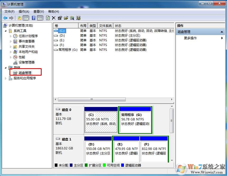 2、打開計(jì)算機(jī)管理之后,點(diǎn)擊【磁盤管理】,如下圖所示