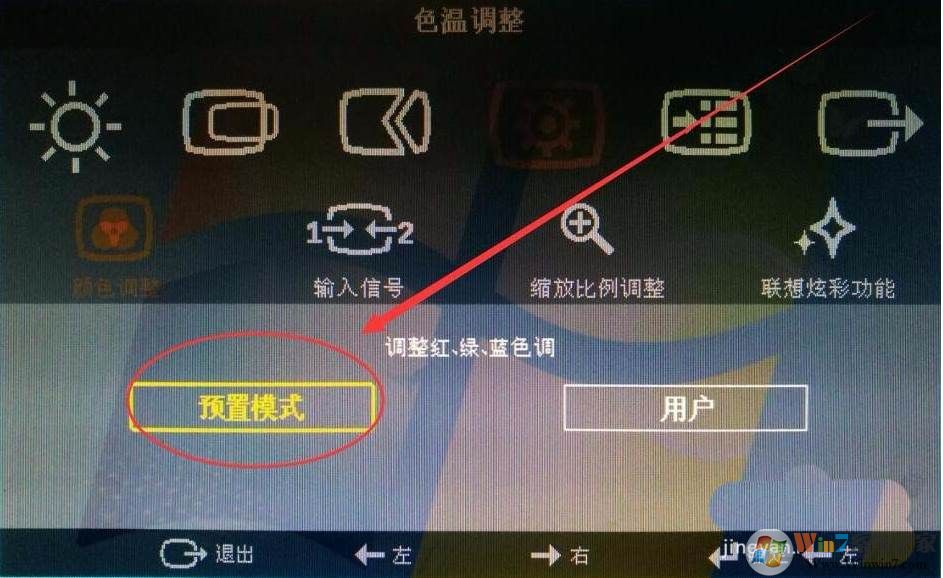 5、這時(shí)我們開(kāi)始調(diào)顯示器,使用顯示器面板上的按鈕,將顯示器顏色設(shè)置為默認(rèn)顏色。(預(yù)設(shè)模式)不同的顯示器按鈕和方法不同。