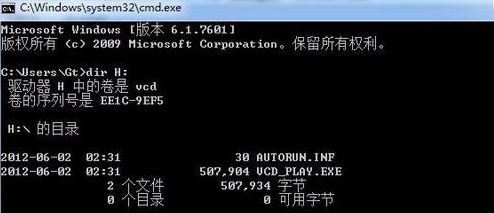 2、假設光盤盤符是H:,在命令提示符中輸入 dir H: 按下回車鍵;