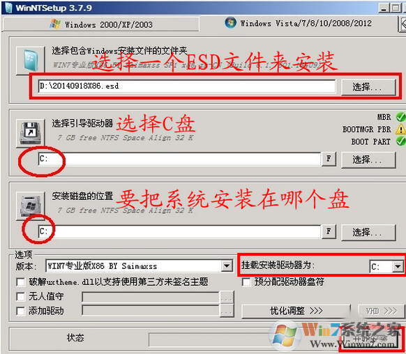 1、打開winntsetup,在“選擇包含windows安裝文件的文件夾”這里,點擊“選擇”找到你的ESD安裝文件。“選擇引導(dǎo)驅(qū)動器”默認(rèn)為C盤,“安裝磁盤的位置”是指你要把系統(tǒng)安裝到哪個盤,比如C盤,或者D盤等。下面的“選項”一欄有一個“版本”,是指的所要安裝的系統(tǒng)的版本,如果ESD文件中有多個版本的話,可以在這里進(jìn)行選擇。“掛載安裝驅(qū)動器”默認(rèn)為C盤。點擊“開始安裝”按鈕,準(zhǔn)備安裝系統(tǒng)。