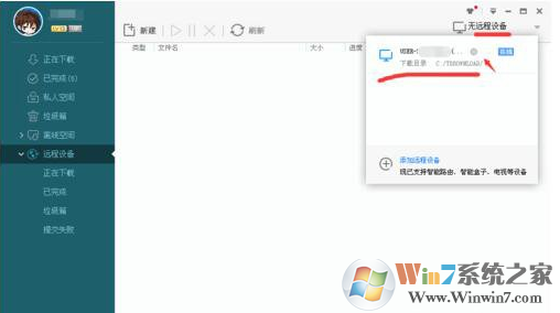 1、打開迅雷極速版下載,然后登陸迅雷賬號(hào),也可以先登陸,看一下面板下面有一項(xiàng)是遠(yuǎn)程設(shè)備,我的沒有呢要去添加,這時(shí)可以看右上角點(diǎn)擊無遠(yuǎn)程設(shè)備。