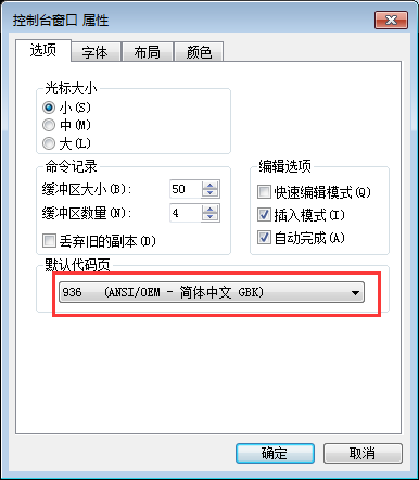 2、 這時(shí)會(huì)出現(xiàn)控制臺(tái)窗口 屬性的界面,我們?cè)谀J(rèn)代碼頁(yè),這里選擇為“936(ANSI/OEM -簡(jiǎn)體中文 GBK)”