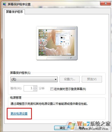 3、接著會彈出屏幕保護程序設(shè)置窗口,選擇下方的“更改電源設(shè)置”;