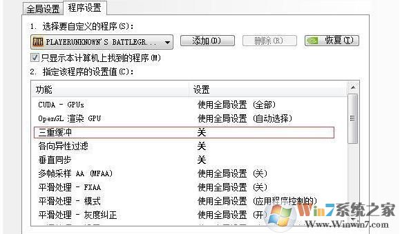 5、在這里朋友們可以看到有兩個設(shè)置,一個是全局設(shè)置、一個是程序設(shè)置,推薦大家使用程序設(shè)置,這樣的話除了吃雞更改了低配模式,其他的不會太乞丐。